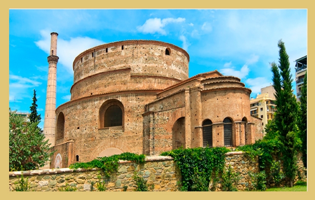 Η Ροτόντα ανήκει στα περίκεντρα οικοδομήματα, στο κυκλικό της σχήμα άλλωστε οφείλει και την ονομασία της. Κτίστηκε στα χρόνια του καίσαρα Γαλερίου, γύρω στα 306 μ.Χ., ως ναός του Δία ή του Κάβειρου ή κατ΄ άλλους ως Μαυσωλείο του ιδίου.