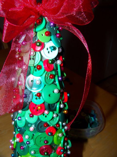 Στό τέλος στολίζουμε με ζεστή σιλικόνη το δέντρο με τα κουμπιά και κάποιες μπαλίτσες.